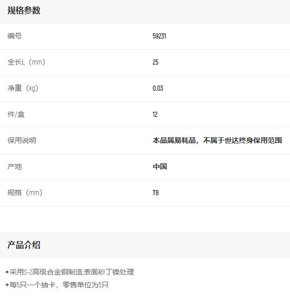 產(chǎn)品名字:世達(dá)5件套6.3MM系列25mm長花型旋具頭T8