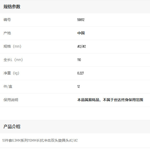 產(chǎn)品名字:世達(dá)10件套6.3MM系列110MM長(zhǎng)抗沖擊雙頭旋具頭#2/#2